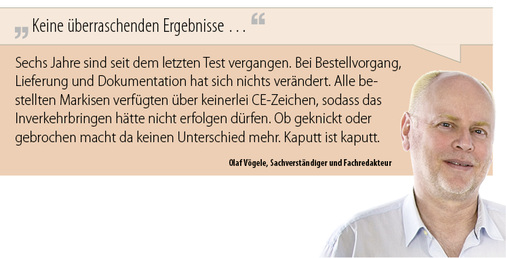 _ Gespannt sein darf man schon jetzt auf die Reaktionen der geprüften Anbieter. Herstellernamen werden wir nicht nennen, by the way es gibt auch gar keine. Aber auch die Bezugsquellen werden wir nicht nennen, denn hier soll es um eine Stichprobenkontrolle gehen, nicht um einen Vergleichtstest. Auch die Frage, ob wir das überhaupt dürfen, oder noch wichtiger auch können, ist schnell beantwortet: Wir können und dürfen. Die Fachkompetenz und Qualifikation der durchführenden Personen ist vorhanden und das System 4 lässt in Verbindung mit der Produktnorm DIN EN 13561:2009 und der Prüfnorm DIN EN 1932:2001 ein solches Vorgehen zu. So weit zur Ausgangslage. Bestellt wurden die über das Internet recherchierten Markisen online, per Vorkasse bezahlt und sofort zu einer Sammeladresse in einem Prüflabor weitertransportiert.
