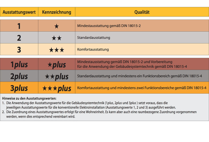 Diese Richtlinie für moderne und zukunftsfähige Elektroinstallation beschreibt in sechs Stufen den möglichen Ausstattungsumfang einer Elektroinstallation: Die ersten drei Werte bezeichnen die Basisinstallation, die sogenannten Plus- Ausstattungswerte legen die Grundlage für eine Gebäudesystemtechnik. Bereits für etwa sieben Prozent der Bausumme lassen sich auf Basis des Ausstattungswertes 2 plus einzelne Funktionsbereiche im Haus oder in der Wohnung mit intelligenter Technik ausstatten. Möglich sind dann beispielsweise eine intelligente Beleuchtung mit Bewegungs- und Präsenzmeldern oder eine automatisierte Jalousien- und Rollladensteuerung.