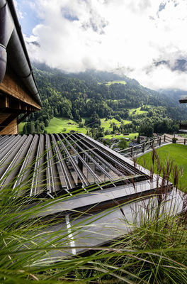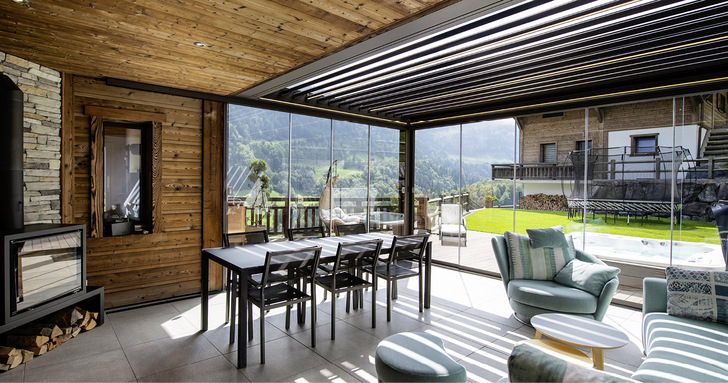 Die langen, schwenkbaren Lamellen auf dem Dach ermöglichen eine gute Belüftung und Lichtregulierung des Raumes, garantieren aber gleichzeitig - im geschlossenen Zustand - ein schneedichtes Dach. Das Lamellendach Kedry Prime wurde farblich in einem Braunton umgesetzt und fügt sich so harmonisch an das im Wohnhaus dominierende Holz und den architektonischen Stil des Chalets.