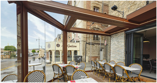 Der vorhandene Sonnenschutz wurde durch die bioklimatische Pergolamarkise Kedry Skylife ersetzt, die funktionell und robust ist und dank ihres flachen Dachs eine geradlinigere Ästhetik aufweist, sowie durch die Gelenkarmmarkise Qubica Light. Geschlossen mit den Panoramafenstern Line Glass bietet die Pergola so zu jeder Jahreszeit Schutz vor Regen und Wind. Die Wahl der Verglasung Line Glass ermöglicht also einerseits eine vollständige und klare Sicht auf den Hafen von Dieppe und andererseits, in Kombination mit den einfahrbaren Lamellen, eine Beleuchtung der Innenräume mit Tageslicht.
