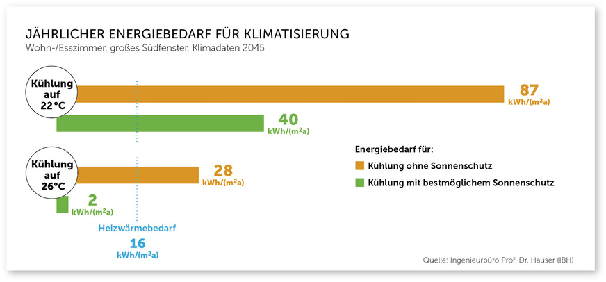 Ein typisches Wohn- und Esszimmer mit großer Fensterfront nach Süden erfüllte in der Vergangenheit mit einem bestmöglichen innenliegenden Sonnenschutz gerade noch die Anforderungen. Damit blieb der Raum – von einzelnen Temperaturspitzen im Juli und August abgesehen – verträglich temperiert. Durch den Klimawandel wird der gleiche Raum in Zukunft in den Sommermonaten regelmäßig die 30 °C-Marke überschreiten. Aber: Ein wirksamer außenliegender Sonnenschutz wie bspw. ein Rollladen oder eine Außenjalousie vermeiden diese Überhitzung nahezu vollständig. Besonders wirksam ist Sonnenschutz, wenn er automatisch aktiviert wird und so auch bei Abwesenheit nicht in Vergessenheit gerät. Ergänzend verbessert auch eine konsequente Lüftung in der Nacht die Innentemperatur. „Werden diese Möglichkeiten im Neubau und bei Sanierungen gut genutzt, funktionieren unsere Gebäude. Fenster- und Glasflächen können in den kühleren Monaten durch die Sonneneinstrahlung kostenfreie Wärme liefern, ohne im Sommer zu Überhitzung zu führen“, erläutert Schlitzberger weiter.