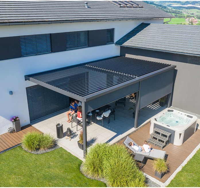 Als Terrassenüberdachung ist das Lamellendach freistehend sowie als Wandmontage zum Sonnen-, Regen- und Schneeschutz geeignet. Es überzeugt als 100 % wasserdichte und mit einer zulässigen Schneelast von 112 kg/m2 absolut solide und allwettertaugliche Terrassenlösung. Die robuste Aluminiumkonstruktion hält so gut wie jeder Wetterlage stand und die Lamellen schließen absolut wasserdicht. Damit dient sie nicht nur im Sommer als perfekter Schattenspender, sondern verlängert als Regen- und Schneeschutz die Outdoor Saison bis in den Herbst oder Winter – man kann das Terrassendach auch optional mit einem Heizstrahler ausstatten. Durch eine integrierbare LED-Beleuchtung sorgt sie auch in langen Sommernächten für eine stimmungsvolle Atmosphäre. Es ist als Einzelanlage in einer Größe von 6 × 4 m erhätlich und kann als 3-Feld-Anlage auf eine Gesamtbreite von bis zu 12 m erweitert werden.