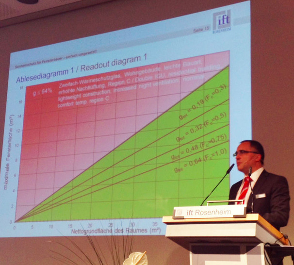 "Sonnenschutz für den Fensterbauer - einfach umgesetzt" lautete das Vortragsthema von Dr. Spitzner auf den Rosenheimer Fenstertagen. Der sommerliche Wärmeschutz stand bei dem Vortrag des Physikers im Vordergrund seiner Ausführungen, bei dem alle relevanten Kenngrößen rund um das Fenster und dem Sonnenschutz in Abstimmung mit den Neuerungen der DIN 4108 zur Sprache kamen. Eine einfache Lösung zur Beurteilung von Sonnenschutz wurde auch vorgestellt.