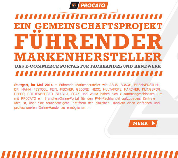 Führende Markenhersteller wie Abus, Bosch, Brennenstuhl, Dr. Hahn, Festool, Fein, Fischer, Gedore, Heco, Hultafors, Kärcher, Klingspor, Pferd, Rothenberger, Stabila, Spax und Wiha haben sich zusammengeschlossen, um mit Procato ein Branchen-Online-Portal für den Fachhandel aufzubauen. Zentrale Idee ist, über eine brancheneigene Plattform den einzelnen Händlern einen einfachen und professionellen Online-Handel zu ermöglichen.