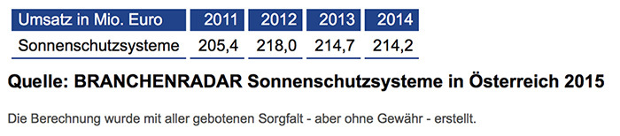 In Anbetracht der schrumpfenden Nachfrage nach Fenstern und des generell schwachen Sanierungsmarktes konnte man bei Sonnenschutzsystemen im vergangenen Jahr nicht wirklich mit einer Ausweitung der Nachfrage rechnen. Insofern wurde die mit ca. 500.000 Euro geringe Umsatzstagnation von den Anbietern mit Erleichterung aufgenommen. Wie bereits im Jahr 2013 lagen die Herstellererlöse bei rund 214 Millionen Euro (minus 0,2% geg. VJ).