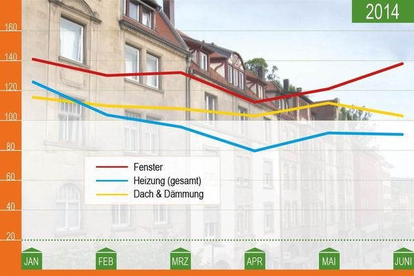 Bei Heizungen blieb die Nachfrage in vier der sechs ersten Monate des Jahres unter dem Index 100, bei Fenstern lag sie immer deutlich über der 100. Auch Dach und Dämmung schneiden relativ gut ab. Im Mai 2014 hatte sich für alle drei Segmente eine Besserung abgezeichnet, die sich bei Heizungen und Dämmung als wenig konstant erwiesen hat. Fenster verzeichneten im Mai und Juni nochmals einen ordentlichen Schub.