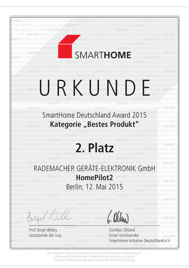 Die SmartHome Deutschland Awards 2015 sind vergeben. Bereits zum 4. Mal verlieh die SmartHome Initiative Deutschland e.V. am 12.05.2015 die begehrte Auszeichnung für herausragende marktfähige Produkte, Lösungen und gewerkeübergreifend umgesetzte Projekte rund um das Thema SmartHome, SmartBuilding und AAL. Rademacher konnte mit dem Homepilot2 im Bereich bestes Produkt hinter der iExergy GmbH den zweiten Platz erreichen.