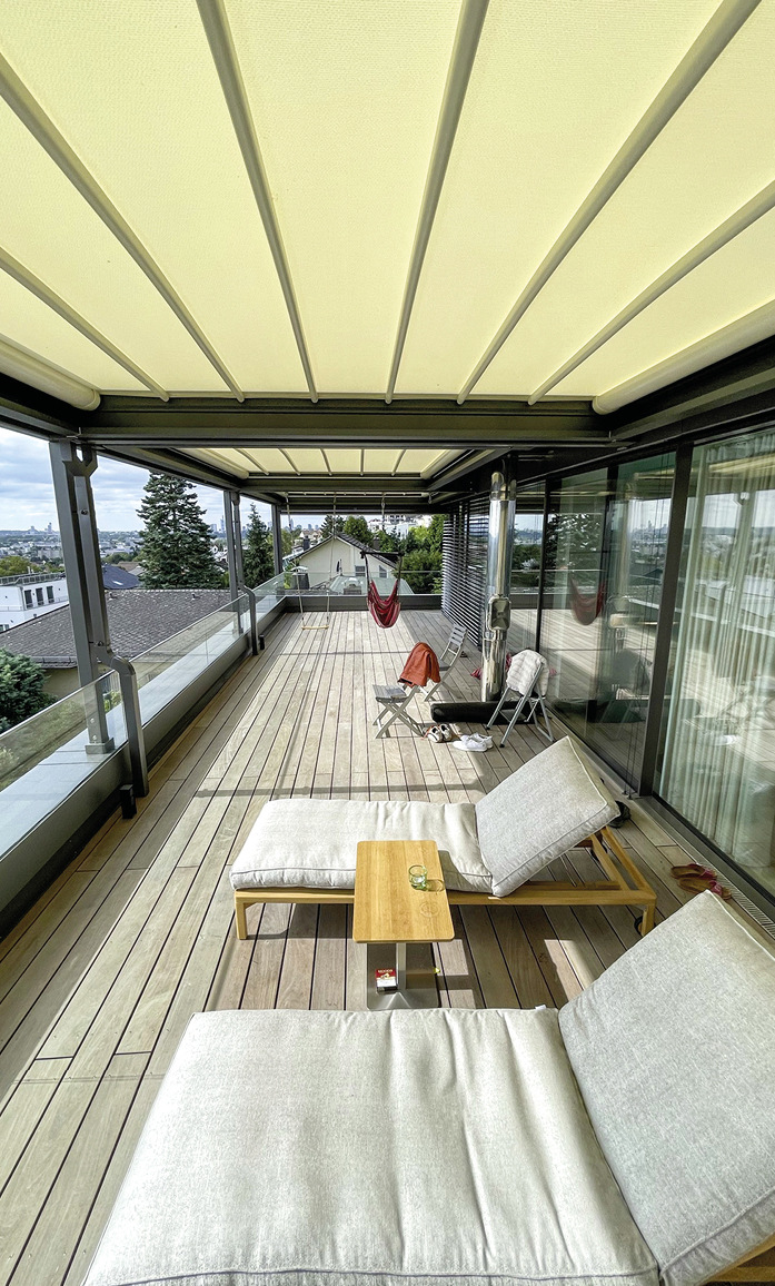 Auf der Dachterrasse in Frankfurt wurde das Pergolasystem Maestro Pergotenda individuell gefertigt, da es ohne die eigentlichen Standsäulen in eine vorhandenene Stahltragkonstruktion eingesetzt wurde. Das Tuchgewebe wurde zu besseren Wasserablauf als gebogene Version ausgeführt. Es ist beweglich und lässt sich mittels verdeckt eingebautem Elektro-Getriebemotor und Fernbedienung komplett zusammenfalten. Im geschlossenen Zustand schützt die Tuchabdeckung vor Sonneneinstrahlung und vor Regen. Das Regenwasser wird über am Tuchende integrierte Regenrinnen und in diesem Fall wegen der fehlenden Pergolastützen über speziell von Stahlwerk angefertigte Abdeckungen und Fallrohre abgeleitet. Der jeweils seitliche Abschluss erfolgt bei der Sonnen- und Wetterschutzkonstruktion über integrierte ZIP-Systeme. Zum Nachbargebäude mit einem teiltransparenten Gewebe als Sichtschutz, zur anderen Seite als durchsichtiges Gewebe Cristall, um einen freien Ausblick zu haben und gleichzeitig vor Wind oder Regen geschützt zu sein. Gesteuert wrid das Ganze über die Gebäudeautomation oder zum manuellen Eingriff über Fernbedienung, ganz wie es den Hausbewohnern beliebt.