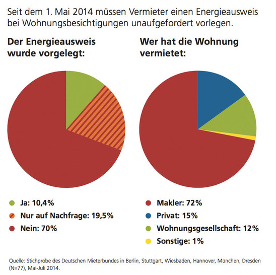 Das Bündnis Energieausweis hat unter Federführung des Deutschen Mieterbundes (DMB) eine Stichprobe zur Vorlagepflicht für Energieausweise bei Wohnungsbesichtigungen in sechs deutschen Städten durchgeführt. Insgesamt wurden 77 Wohnungen in Berlin, Stuttgart, Wiesbaden, Hannover, München und Dresden besichtigt. Die Ergebnisse der Stichprobe sind enttäuschend. Lediglich acht Ausweise (10,4%) wurden ohne Nachfrage vorgelegt.