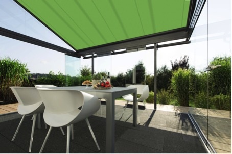 Das Terrassendach SDL Atrium plus solle die Gartensaison auf beinahe 365 Tage im Jahr verlängern. Erweitert um eine senkrechte Verglasung entstehe schnell und einfach ein komplettes Glashaus, das wie ein Außen-Zimmer genutzt werden könne. Die großzügige Transparenz sorge für das vollkommene Outdoor-Gefühl. Sollte die Sonne es besonders gut meinen, könne man mit den Markisen vor blendendem Licht entstehender Hitze schützen und gleichzeitig einen behaglichen Wohnkomfort verbreiten. Mit der secudrive-Führung, bei der es dank eines seitlich geführten Federstahlbandes keine Lichtspalte zwischen Tuch und Schiene gebe, entstehe eine attraktive, ganzheitliche Verschattung mit Stoffspannung.