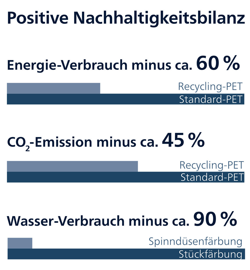 The recycled base material is food-grade PET, a thermoplastic from the polyester family. The high elasticity of polyester fabrics ensures the best possible fabric stability. The memory effect causes the fabric to bounce back better to return to its original state. All fabrics in the modern basics blue awning collection are certified according to ÖKO-Tex Standard 100 and block around 98 % of UV radiation with an ultraviolet protection factor (UPF) of 50+.