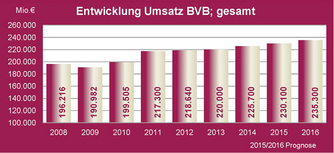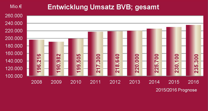 „Wir erwarten in 2015 ein Umsatzwachstum für die Bauwirtschaft von 2 % auf gut 230 Mrd. Euro. Der Bereich Gebäudetechnik wächst mit +2,5 % am stärksten; das Bauhauptgewerbe folgt mit ca. +2 % und der Ausbau erreicht ca. +1,5 %," erklärte am 10.11.2015 der Vorsitzende der Bundesvereinigung Bauwirtschaft, Karl-Heinz Schneider.