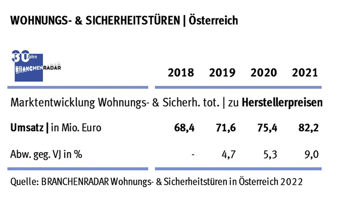 Nicht zuletzt durch steigende Preise beschleunigt sich 2021 das Wachstum am Markt für Wohnungseingangstüren in Österreich signifikant. Wohnungstüren ohne Einbruchschutz spielten übrigens keine Rolle mehr, dafür aber RC3 umso mehr.