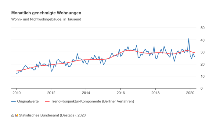Im Mai 2020 ist in Deutschland der Bau von insgesamt 32.000 Wohnungen genehmigt worden. Das waren 3,9 % mehr als im Mai 2019. Die Zahl der Baugenehmigungen steigt besonders stark bei Mehrfamilienhäusern. Es gab aber auch Bereiche, in denen deutliche Rückgänge zu verzeichnen waren.