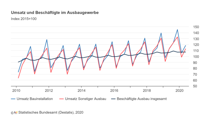 Im 2. Quartal 2020 stiegen die Umsätze im Ausbaugewerbe um 3,0 % gegenüber dem 2. Quartal 2019 und damit seit 5 Jahren in Folge (seit dem 3. Quartal 2015). Wie das Statistische Bundesamt weiter mitteilt, waren im 2. Quartal 2020 im Ausbaugewerbe 0,8 % mehr Beschäftigte tätig als im Vorjahreszeitraum beschäftigt. Destatis berichtet auch, ob die Corona-Pandemie Auswirkungen auf die Geschäfte hat.
