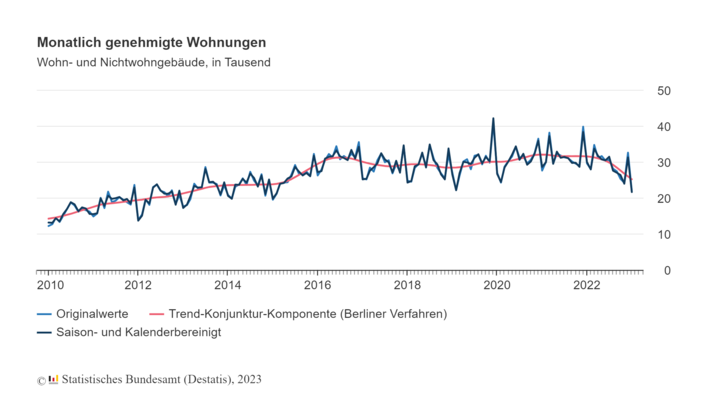 Die Zahl genehmigter Wohnungen von Januar bis März 2023 ist im Vergleich zum Vorjahreszeitraum um mehr als 25 Prozent eingebrochen. Einen stärkeren Rückgang als im März 2023 hatte es zuletzt 2007 gegeben. Besonders auffällig ist der Einbruch bei den Genehmigungen für Zweifamilienhäusern.