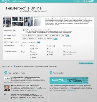 Die GLASWELT bietet Ihren Lesern einen einzigartigen Service: Mit einer Datenbank wird ein umfassender Überblick über die Kunststoff-Fensterprofile der Systemhäuser geboten. Damit wird das Produktangebot transparent und vergleichbar: Auf Knopfdruck erhält man alle wichtigen Informationen über die Profilsysteme und deren Eigenschaften.