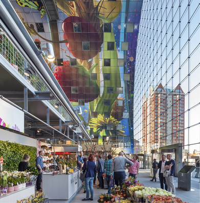 Die Markthalle in Rotterdam, ein Entwurf des Architekturbüros MVRDV, vereint auf einzigartige Art und Weise in einem Gebäude den Marktbetrieb mit Läden und Gastronomie sowie das Wohnen. Eine minimalistische Seilfassade von Octatube erlaubt dabei gleichermaßen den tiefen Einblick von innen und den weiten Blick nach außen.