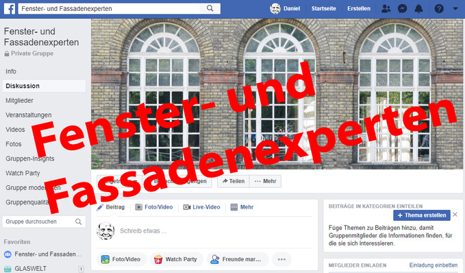 Jetzt gibt es einen Grund mehr, bei Facebook aktiv zu werden: Als Mitglied bei den "Fenster- und Fassadenexperten". Hier können Sie Hilfe bekommen, Fragen stellen, ihr Wissen optimieren, voneinander lernen und Erfahrungen austauschen. Und bitte nicht erschrecken: Die Gruppenmitglieder “dutzen” sich und haben sich alle vorgenommen, respektvoll miteinander umzugehen. Werbung wird übrigens schnellstmöglichst gelöscht...