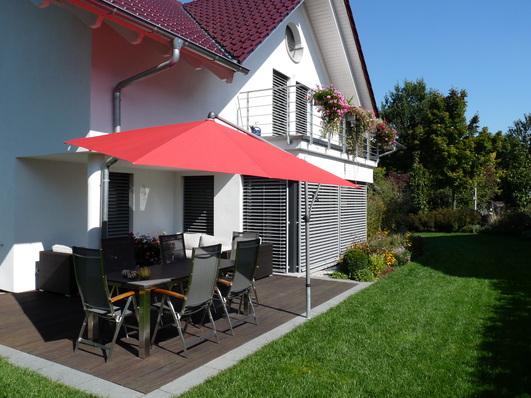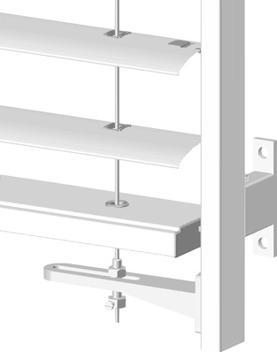 Zusätzliche Seilführungen, die parallel zur Führungsschiene verlaufen und unten über einen Winkel an der Schiene befestigt sind, sollen die Verwendung des windstabilen Raffstore bei Windstärken bis zu 22 m/s ohne die Gefahr von Verformungen oder einer Beschädigung möglich machen.