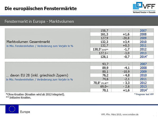Der Fenstermarkt in Europa und den wichtigsten angrenzenden Ländern ist 2014 um insgesamt 0,7 % im Vergleich zum Vorjahr gesunken. Damit bleibt die Lage relativ stabil, nachdem der Markt 2012 und 2013 leichte Rückgänge von 1,7 und 3,0 % verzeichnen musste, so der VFF-GF Ulrich Tschorn in einer Pressekonferenz letzte Woche.