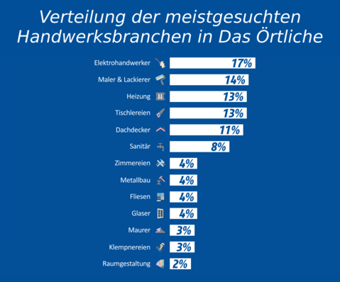Laut einer Studie der GfK haben 2017 knapp 28 Mio. Nutzer in "Das Örtliche" nach Unternehmen oder Dienstleistungen gesucht. Dabei fielen den 13 Top-Branchen im Bereich Handwerk über 3,6 Mio. Suchanfragen zu. Insgesamt steht die Suche nach Handwerkern damit auf Platz Drei aller gewerblichen Suchen. Schauen Sie mal, mit welchen Suchbegriffen nach Glasern und Fensterbauern oder Schreiner gesucht wird.