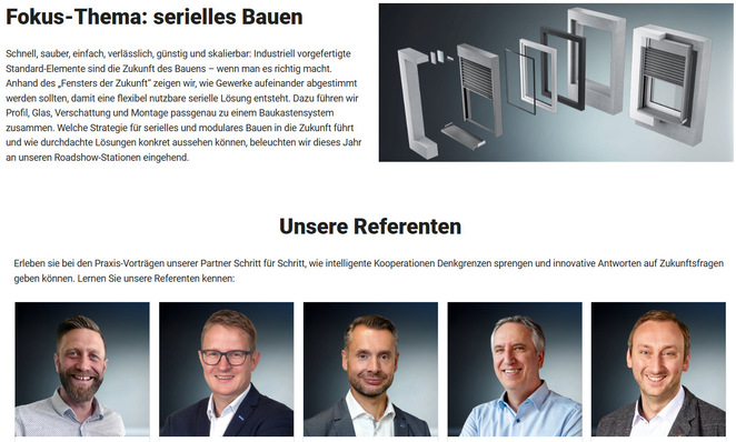 Von Profil über Glas bis Sonnenschutz: Vier Fensterzulieferer demonstrieren, wie Gewerke beim seriellen Bauen optimal zusammenwirken. Die kostenlose aber anmeldungspflichtige Roadshow startet am 25.02. in Hof und endet am 11.06. in Bischofswerda. Jedes Mal dabei: Ein Keyspeaker aus der Fensterbranche, der sich mit dem seriellen Bauen intensiv beschäftigt hat.