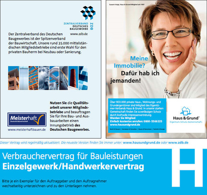 Gut zu wissen, dass der Eigentümerverband Haus & Grund und der Zentralverband Deutsches Baugewerbe (ZDB) ihre im August 2008 erstmals gemeinsam herausgegebenen Bauvertragsmuster an die am 13. Juni 2014 in Kraft tretenden Gesetzesänderungen angepasst haben. Ab diesem Stichtag steht dem Verbraucher bei Vertragsabschlüssen mit einem Bauunternehmer in bestimmten Fällen ein Widerrufsrecht zu.