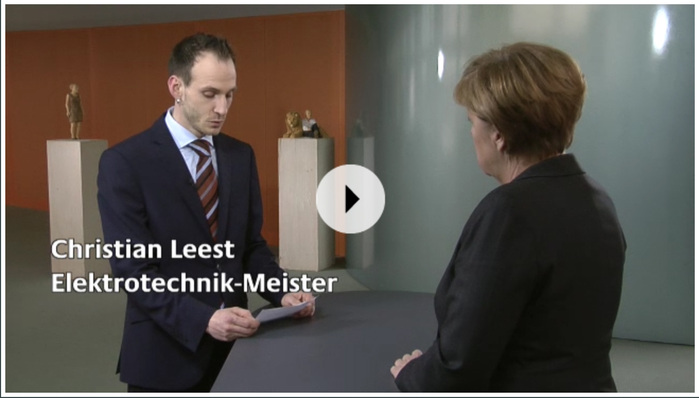Bundeskanzlerin Angela Merkel will die duale Berufsausbildung und die Meisterausbildung erhalten. Sie kämpfe dafür, dass sich "die europäischen Regelungen nicht unserer dualen Berufsausbildung entgegenstellen", sagt Merkel in ihrem Video-Podcast bei dem Dialog mit Elektrotechnik-Meister Christian Leest vom 30. Januar. Es müsse weiter möglich sein, über die duale Berufsausbildung und die Meisterausbildung Abschlüsse zu machen.
