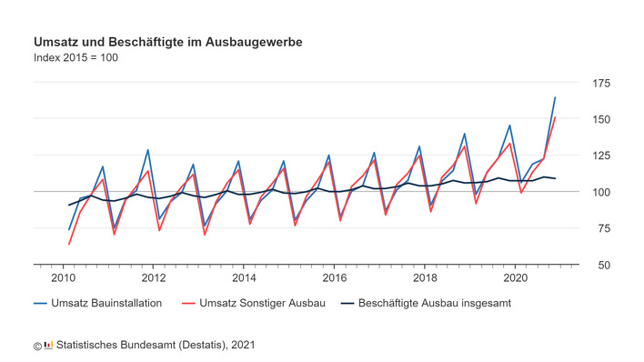 Das Ausbaugewerbe hat 2020 trotz der Corona-Krise einen 6,2 % höheren Umsatz als 2019 erzielt. Damit ist der Umsatz des Ausbaugewerbes im siebten Jahr in Folge gestiegen. Das letzte Quartal des Jahres nimmt einen besonders steilen Verlauf.