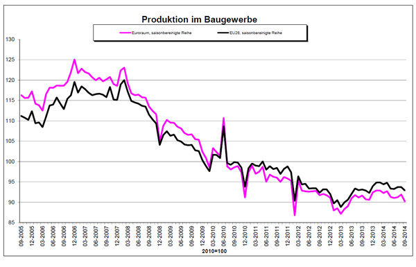 Im September 2014 fiel die saisonbereinigte Produktion im Baugewerbe gegenüber August 2014 im Euroraum um 1,8% und in der EU282 um 0,9%, laut ersten Schätzungen von Eurostat, dem statistischen Amt der Europäischen Union.