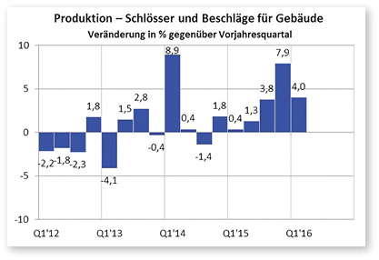 Der Wert der in Deutschland produzierten Schlösser und Beschläge liegt laut Statistischem Bundesamt im 1. Quartal 2016 mit insgesamt rund 1,84 Mrd. Euro über dem Vorjahresquartal. Dies bedeutet ein Plus von 1,5 % im Vorjahresvergleich. Bei Schlössern und Beschlägen für Gebäude sind im 1...