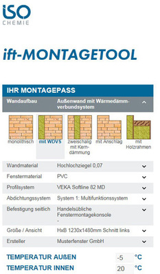 Der Abdichtungsspezialist ISO-Chemie bietet in seinem Online-Portal die Möglichkeit, einen ift-Montagepass zu erstellen. Dieser kann sowohl als Planungshilfe für eine objektbezogene Montageausführung verwendet werden, als auch als Nachweis einer fachgerechten und bauphysikalisch korrekten Planung der Anschlussausbildung genutzt werden.