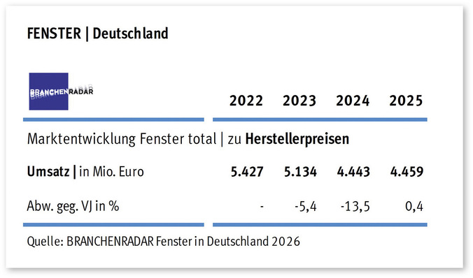 Der deutsche Fenstermarkt konsolidierte sich 2025 leicht über Vorjahresniveau. Wachstumsimpulse kamen von der Sanierung, zeigen aktuelle Daten einer Marktstudie des Marktforschungsinstituts Branchenradar.
