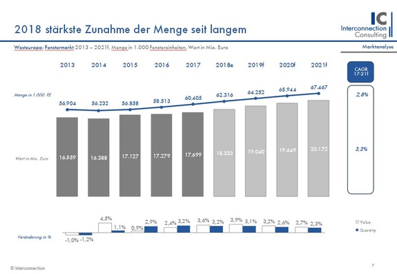 Der Markt für Fenster in Westeuropa wird in diesem Jahr um 3,6 % ansteigen. Bis 2021 wird ein durchschnittliches Wachstum für die Branche von 3,3 % prognostiziert, wie eine Studie von Interconnection Consulting zeigt. Für den deutschen Fenstermarkt sagt man 2018 ein Plus von 5,4 % voraus.