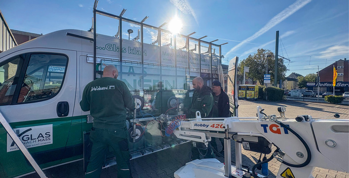 Montagen müssen heute zügig und sicher umgesetzt werden. Hier bewährt sich der Einsatz von Hebegeräten. Beim Baustellenbesuch in Duisburg zeigte sich, wie ein Robby‑420‑Vakuumheber die Monteure der Glaserei Jansen unterstützt. Das Besondere: Der Heber wird im Transporter mitgeführt. Möglich wird das durch eine spezielle Innenausstattung von Hegla Fahrzeugbau. Wie ein solcher Einsatz abläuft, hat sich GW‑Redakteur Matthias Rehberger vor Ort angeschaut.