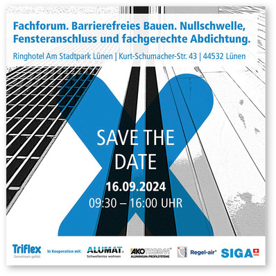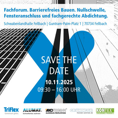Das Fachforum Barrierefreies Bauen geht im November in die nächste Runde: Am 10. November in der Schwabenlandhalle Fellbach und am 13. November auf dem GLS Campus Berlin zeigen Experten praxiserprobte Lösungen für schwellenlose Fenster- und Türanschlüsse. Abdichtungsspezialist Triflex hat die Veranstaltungsreihe mit neuen und bestehenden Partnern (Alumat, Akotherm, Gröninger, Kontex) angepasst.