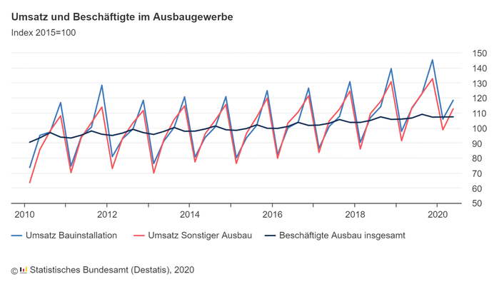 Im 2. Quartal 2020 stiegen die Umsätze im Ausbaugewerbe um 3,0 % gegenüber dem 2. Quartal 2019 und damit seit 5 Jahren in Folge (seit dem 3. Quartal 2015). Wie das Statistische Bundesamt weiter mitteilt, waren in Q2 im Ausbaugewerbe 0,8 % mehr Beschäftigte tätig als im Vorjahreszeitraum.