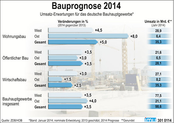 Für das Baugewerbe rechnen die Präsidenten des Hauptverbands der Deutschen Bauindustrie (HDB) und des Zentralverbands Deutsches Baugewerbe (ZDB) für 2014 mit einem Umsatzplus von 3,5 %. Damit werde der Umsatz knapp unter 100 Mrd. bei 98,6 Mrd. Euro liegen. Die Zahl der Beschäftigten steige auf...