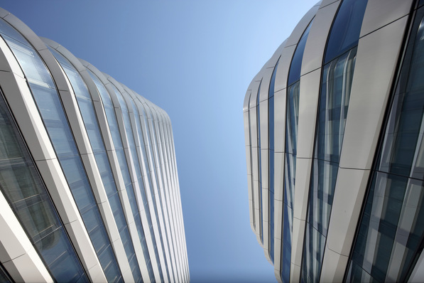 Dem Bau des „Redmolen“-Gebäudes im Hafen von Kopenhagen waren vielfältige Tageslichtanalysen vorangegangen. Das Ergebnis: Eine 12 000 m² große Elementfassade, deren Neigung das Tageslicht je nach Bedarf filtert. Eingesetzt wurden dabei die Fassadengläser Cool-Lite SKN 176 und Eclaz von Saint-Gobain.