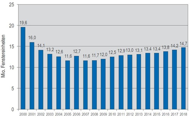 Der Fenstermarkt befindet sich in einem stabilen Aufwärtstrend – jetzt schon 11 Jahre lang. 2018 beträgt das Plus nun noch 2,1 % bei einem Gesamtvolumen auf 14,5 Mio. Fenstereinheiten. 2019 sollen es noch einmal 1,5 % mehr sein.