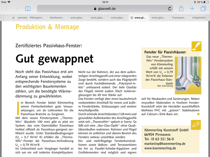 Das "Thermo Win" Fenstersystem vom Kömmerling hatte eine Bautiefe von 100 mm und war vom Darmstädter Passivhaus Institut zu Beginn der 2000er Jahre offiziell als passivhaustaugliches Fensterelement bestätigt worden.