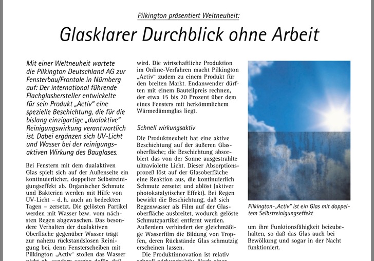 Bei Pilkington Activ werden organischer Schmutz sowie Bakterien mit Hilfe des in den Sonnenstrahlen enthaltenen UV-Lichts zersetzt und die gelösten Partikel anschließend mit dem nächsten Regen oder mit Wasser einfach abgewaschen. Das Besondere an dem System sei nach Auskunft der Entwickler die fast rückhaltlose Reinigung der Scheibe.