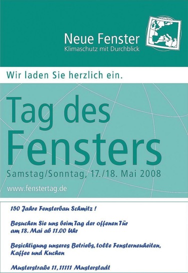 Der VFF ruft alle Fensterhersteller, Bauelemente-Fachhändler, Handwerksbetriebe und andere Unternehmen der Fensterbranche zur Teilnahme am „Tag des Fensters 2008“ auf. Der bundesweite Aktionstag findet am Samstag, 17. und Sonntag, 18. Mai statt. Er bietet allen teilnehmenden Betrieben eine öffentlichkeitswirksame Plattform, interessierte Bauherren und Modernisierer über die Leistungsfähigkeit und Produktvielfalt der Branche zu informieren. Gemeinsame Botschaft ist der neue VFF-Slogan „Neue Fenster – Klimaschutz mit Durchblick“.