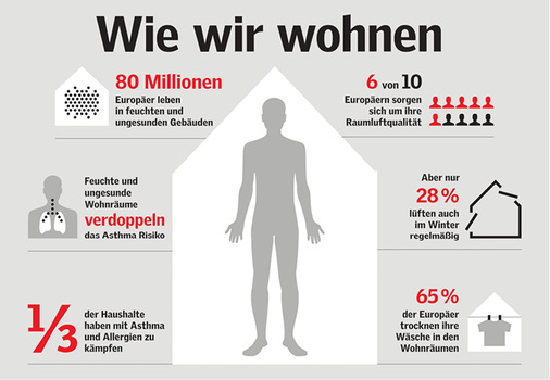 _ Die Geschichte des Wohnens begann damit, dass Menschen „Behausungen“ nutzten, um sich vor Witterungseinflüssen und Übergriffen zu schützen. Im Laufe der Zeit wurden Häuser und Wohnungen immer weiter optimiert und die Bewohner profitierten in den Unterkünften zunehmend auch von konstanten klimatischen Bedingungen. Dem steht jedoch der Nachteil gegenüber, dass die Menschen durch diese Entwicklung einer Vielzahl neuer chemischer, physikalischer, biologischer und mikrobiologischer Faktoren ausgesetzt sind. Denn energiesparende Bauweisen mit fehlender natürlicher Ventilation bei gleichzeitigem Eintrag einer Vielzahl von Chemikalien in die Gebäude führen zu einer Anreicherung von Feuchtigkeit, Mikroorganismen und Chemikalien in Haus, Wohnung oder Büro. Daraus entstehen potenzielle Gefahren für die Gesundheit des Menschen.