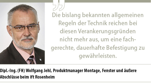 Jehl – Die fachgerechte Befestigung sollte ernst genommen werden und die Montagebetriebe müssen sich auf die veränderten Einbaubedingungen einstellen. Die bislang bekannten allgemeinen Regeln der Technik reichen bei diesen Verankerungsgründen nicht mehr aus, um eine fachgerechte, dauerhafte Befestigung zu gewährleisten. Der Leitfaden zur Montage sowie der ift-Befestigungsplaner geben dazu Hilfestellung und es sollte auch die konkrete Unterstützung von Seiten der Befestigungsmittelhersteller eingefordert werden. Gegebenenfalls können auch alternative Befestigungsmittel in diesen Mauersteinen, z. B. Maueranker, also ein Dübel mit Lasche, eingesetzt werden, da durch die günstigere Lasteinleitung – Querkraft, keine Biegung – höhere Tragfähigkeiten möglich sind.