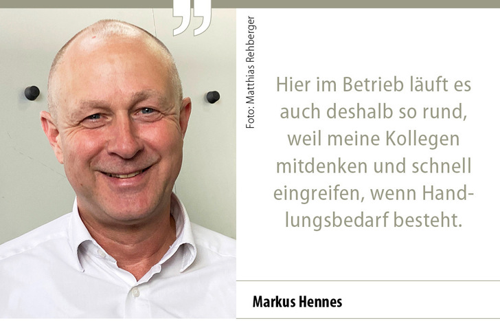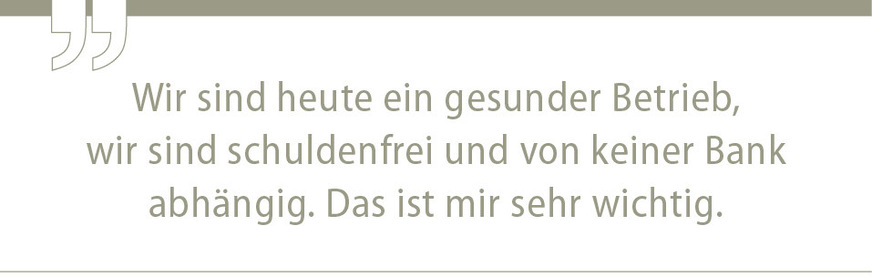 „Wir sind heute ein gesunder Betrieb, wir sind schuldenfrei und von keiner Bank abhängig. Das ist mir sehr wichtig. Wir haben dabei eine sehr starke Mitarbeiterbindung und ich kann mich auf mein Team zu 100 Prozent verlassen. Hier im Betrieb läuft es genau deshalb so rund, weil meine Kollegen mitdenken und schnell eingreifen, wenn Handlungsbedarf besteht. “