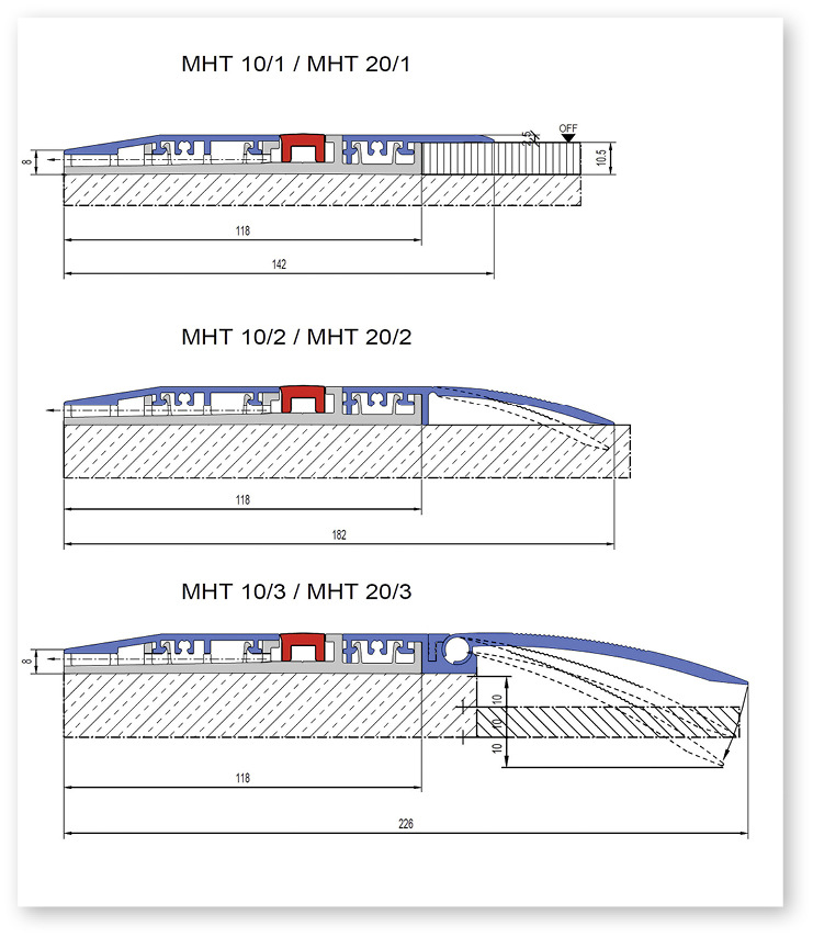 „Wir wollten wirklich so viele Anwendungsfälle wie möglich abdecken“, berichtet Stefan Anwander, Produktmanagement und Prüfwesen. „Deshalb sind wir nicht stehengeblieben, sondern haben zwei ganz neue, speziell für die Sanierung designte Varianten mit nach Nürnberg gebracht, neben der MHT 10 bzw. 20/1 nun die Ausführungen /2 und /3. Bei Letzterer ist es möglich, mit einem anpassbaren Schrägauflauf, Niveauunterschiede von 10 bis 30 mm an der Oberkante des Bodenbelags zu nivellieren.“
