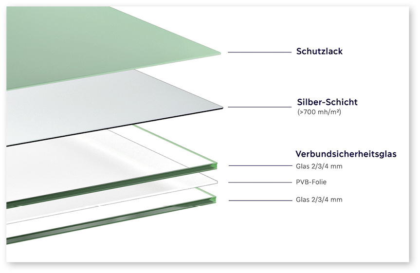 Anforderungen an VSG-Spiegel: Neben den Forderungen aus der harmonisierten VSG-Produktnorm EN 14449 sind für die Verwendung in Deutschland zumeist in den einschlägigen Landesbauordnungen ergänzend zu den Vorgaben der DIN 18008 folgende Eigenschaften beschrieben: Das VSG muss mindestens die Einstufung 2(B)2 gemäß DIN EN 12600 aufweisen. Die Zwischenlage muss aus PVB-Folie mit detailliert beschriebenen Vorgaben bestehen. Bei beschichteten Gläsern muss die Beschichtung auf der von der PVB-Folie abgewandten Seite erfolgen