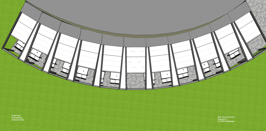 Der obere Teil der Befestigung erfolgte direkt am Mauerwerk. So konnten 11 identische Anlagen der Millenium Celeb mit den Abmessungen 2,2 × 5,8 m im „Halbkreis“ aufgestellt werden. Die resultierenden Lücken zwischen den Führungsschienen wurden mit VSG-Scheiben geschlossen, die entsprechend mit dem Logo des Restaurants oder andernen Applikationen beklebt wurden. So konnte neben der Dichtigkeit des Systems auch der Lichteinfall optmiert werden wenn die Pergolaanlage geschlossen ist. Abends übernimmt diesen Part die im Behang integriete LED Beleuchtung, die durch eine vorne in den Pfosten integrierten Beleuchtung ergänzt wird. Mit der hohen Tuchspannung und der wegfahrbaren Regenrinne sind alle Vorteile der PErgotenda integriert. Den vorderen Abschluss übernehmen 11 Senkrecht-Screens mit ZIP-Führung.